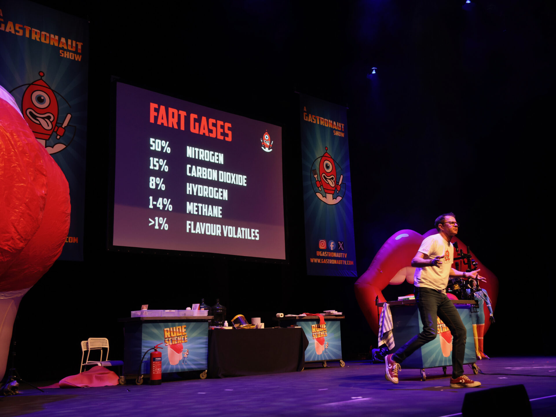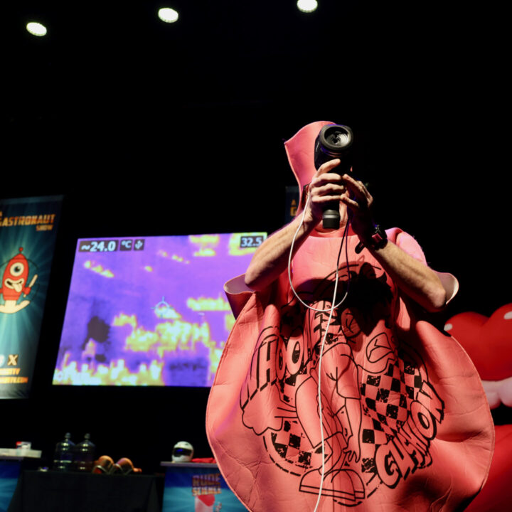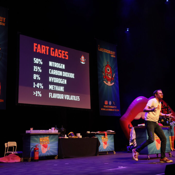 Expect enormous bottoms, f*rt machines, snot cocktails, vast whoopee cushions, pee-powered fireworks and ear-wax-oozing mannequins in this celebration of the fascinating bodily science essential to life. The show transforms complex biology, physics and chemistry into educational hilarity using Stef’s signature stunts and encyclopaedic science knowledge.